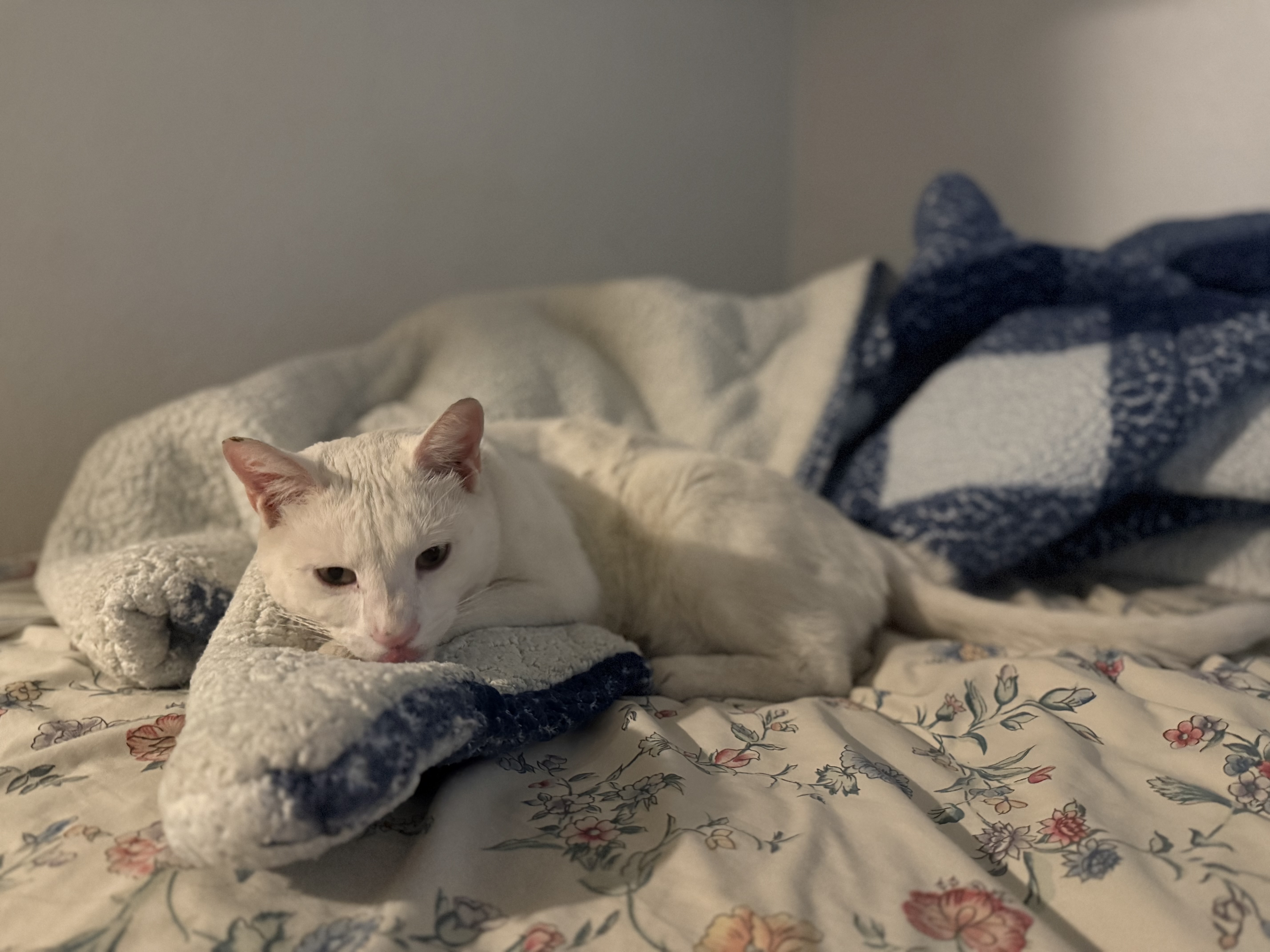 Description: All white cat, green eyes, ears and nose are pink, right ear does have a small black scab